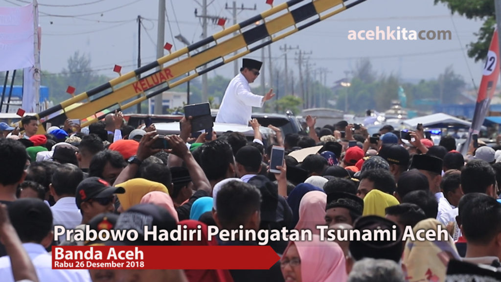 Banda Aceh – Pasangan calon Presiden no urut 2 Prabowo menghadiri peringatan 14 tahun tsunami Aceh yang digelar nelayan pesisi dikawasan Tempat Pelelangan Ikan Lampulo, Banda Aceh, Rabu (26/12).