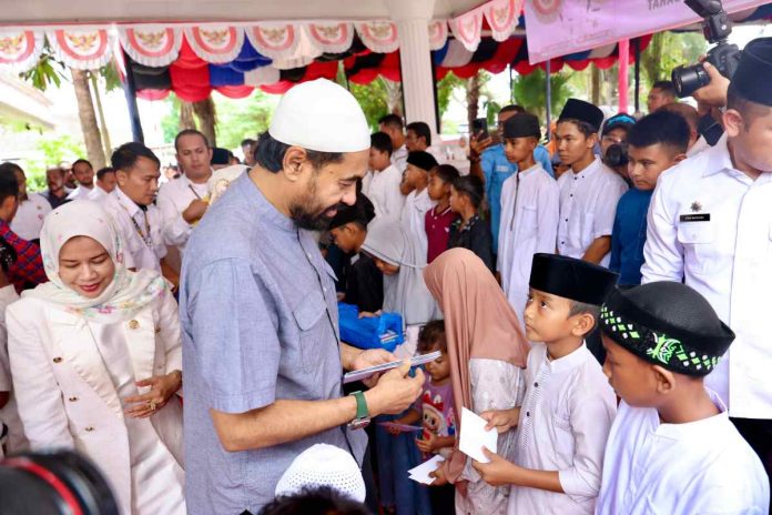 Gubernur Aceh Muzakir Manaf atau Mualem memberikan santunan kepada seribu anak yatim di halaman Pendopo Bupati Aceh Barat, Rabu (4/6/2025).